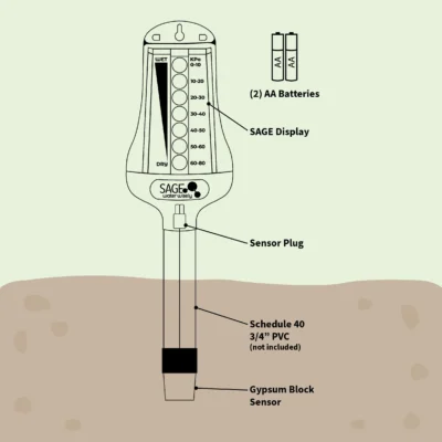 SAGE is an innovative and highly-visual tensiometer type for soil moisture from a distance for a simple indication of when it’s time to irrigate and when to stop.