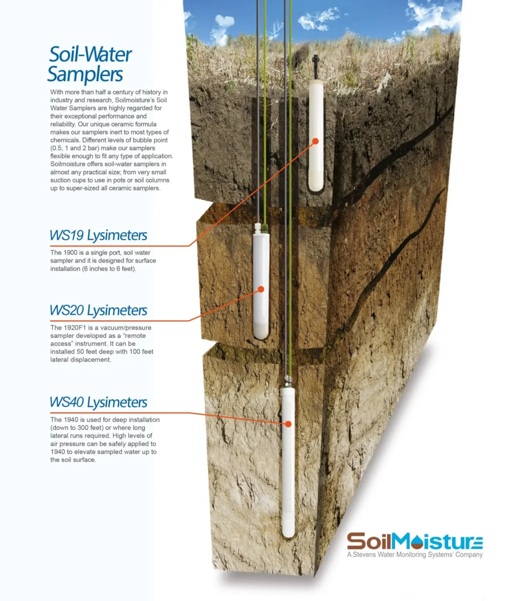 Soil Water Samplers are designed to collect soil water extracted from the soil for onsite or laboratory water quality analysis.