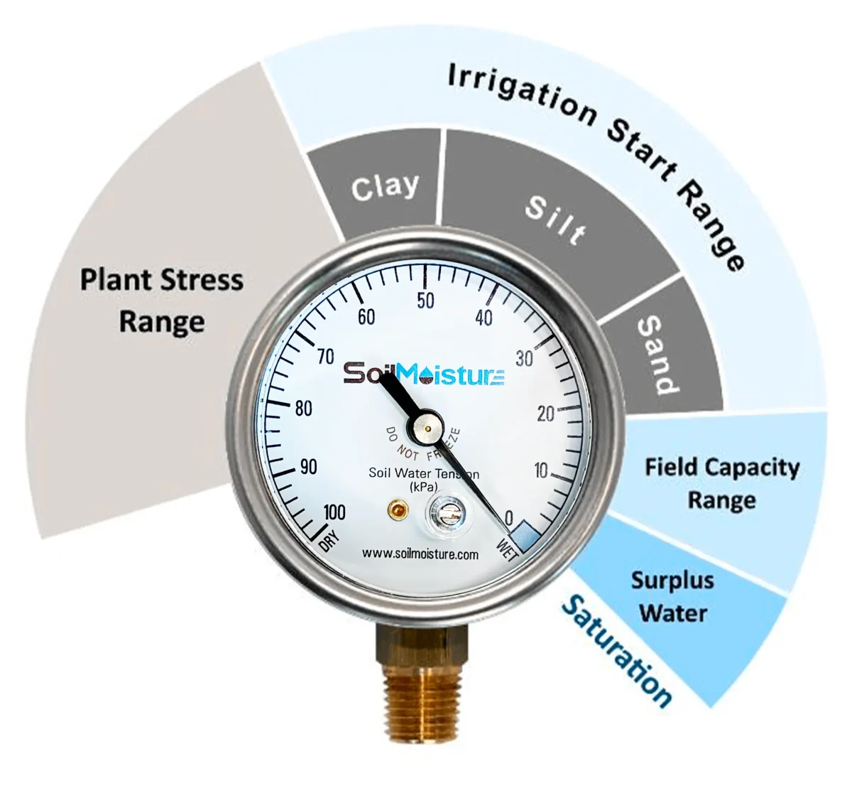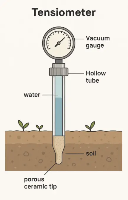 A tensiometer is a device partially inserted into soil to measure the soil water tension. Soil tension (matric potential) is the suction or force needed to pull water from soil pores (by plants or instruments). It reflects how tightly water is held in the soil and how much effort (pressure) plant roots need to exert to extract water from the soil.